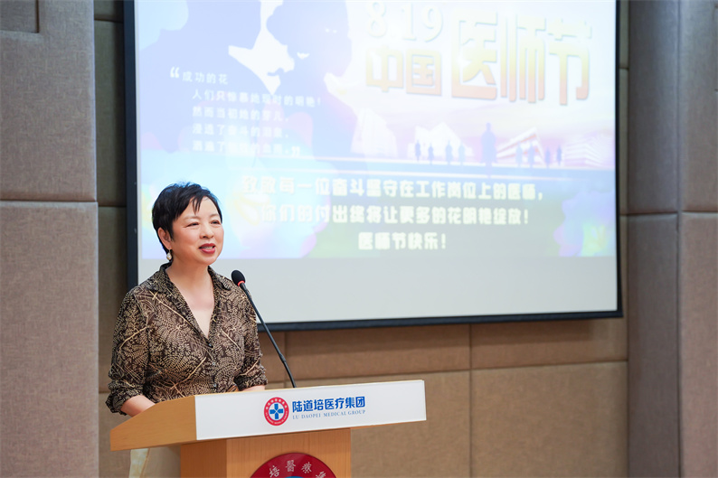 陆道培医院医疗执行院长陆佩华院长致辞,首先祝全体医师节日快乐!同时要感谢病友会的代表精心准备的视频和盛情!在中国医师节这个特殊的日子里,我代表集团向陆院士、纪树荃教授等老一辈医师致以节日的问候!向坚守在一线的核心团队、骨干团队和春苗团队道一声“辛苦”!