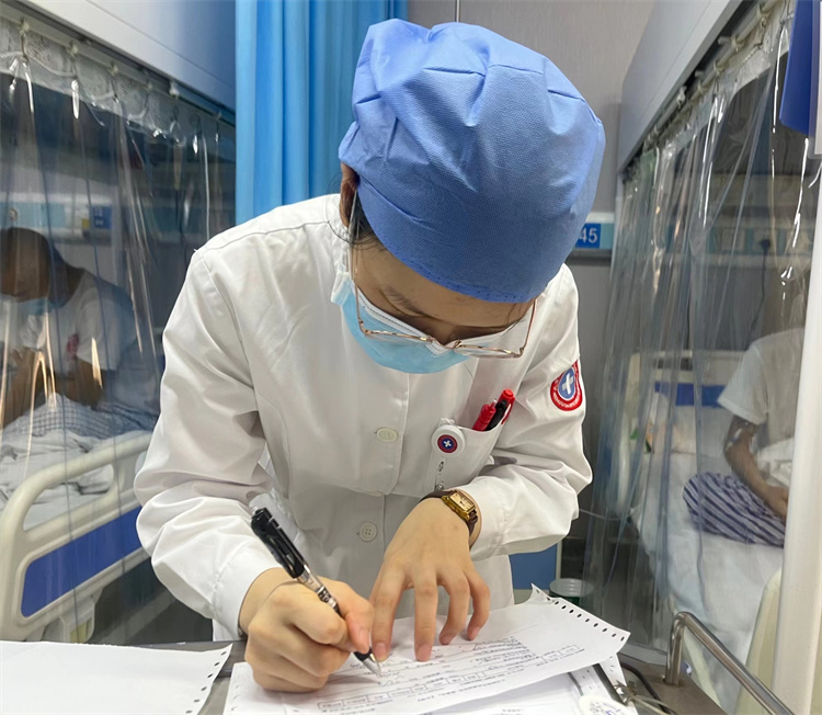 肖老师耐心地解答我的疑惑,为我详细讲解各种物品的用法、药物输注的作用及不良反应、各种管路维护、如何正确消毒、怎么冲封管等等,我用本子记录下来,以便日后反复学习。从患者的言语及家属的反馈中,我知道了肖蔚老师面对任何患者都能“一针见血”,我能感受到他们对肖老师的信任和敬佩。我心里默默地把老师当作我的榜样。