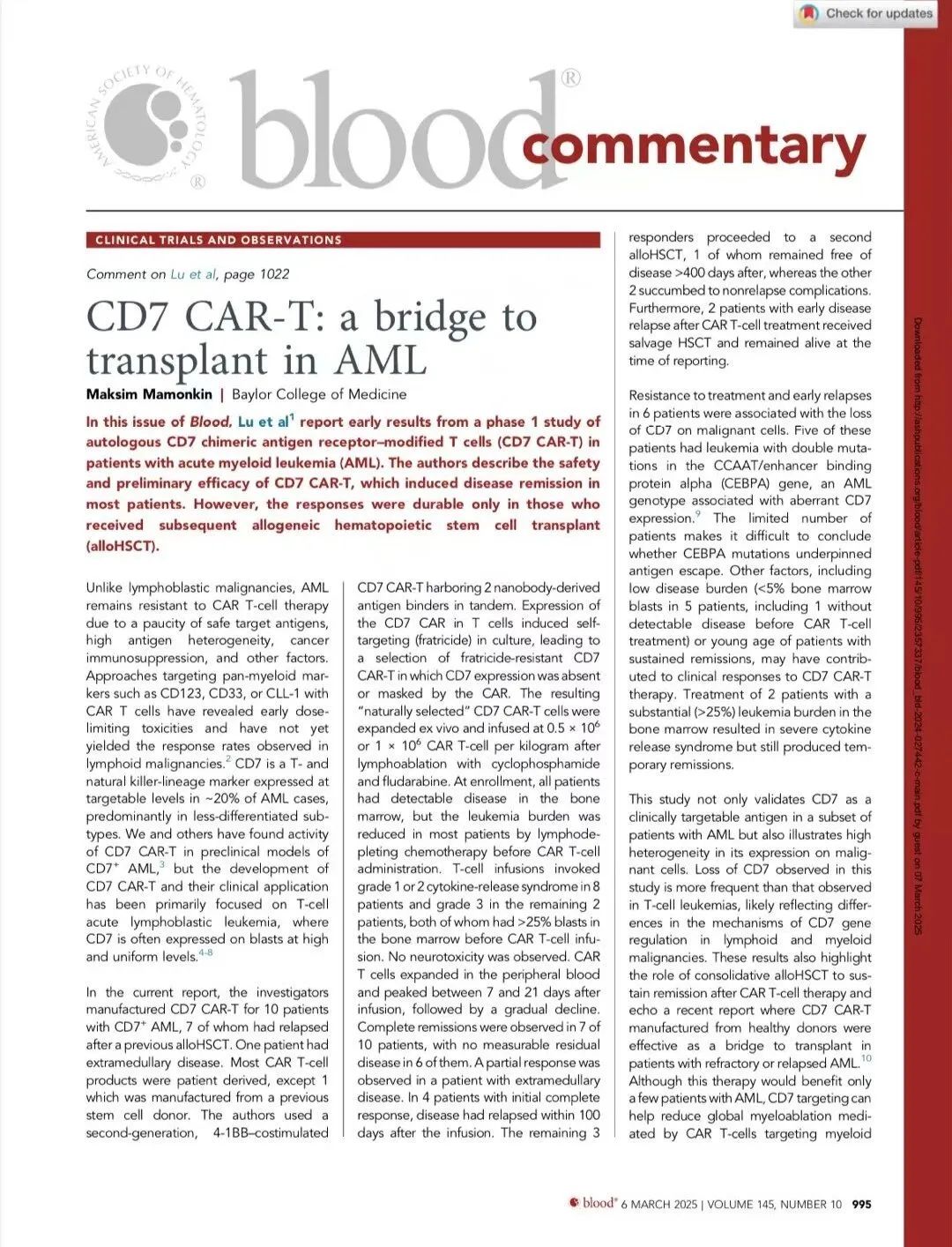 专家评述文章中,不仅认可了团队此项研究的创新性,还强调了CD7 CAR-T细胞治疗作为难治复发AML患者移植桥梁的潜力,预示着这一策略可能改变AML的治疗格局。(评论文章:https://doi.org/10.1182/blood.2024024861)