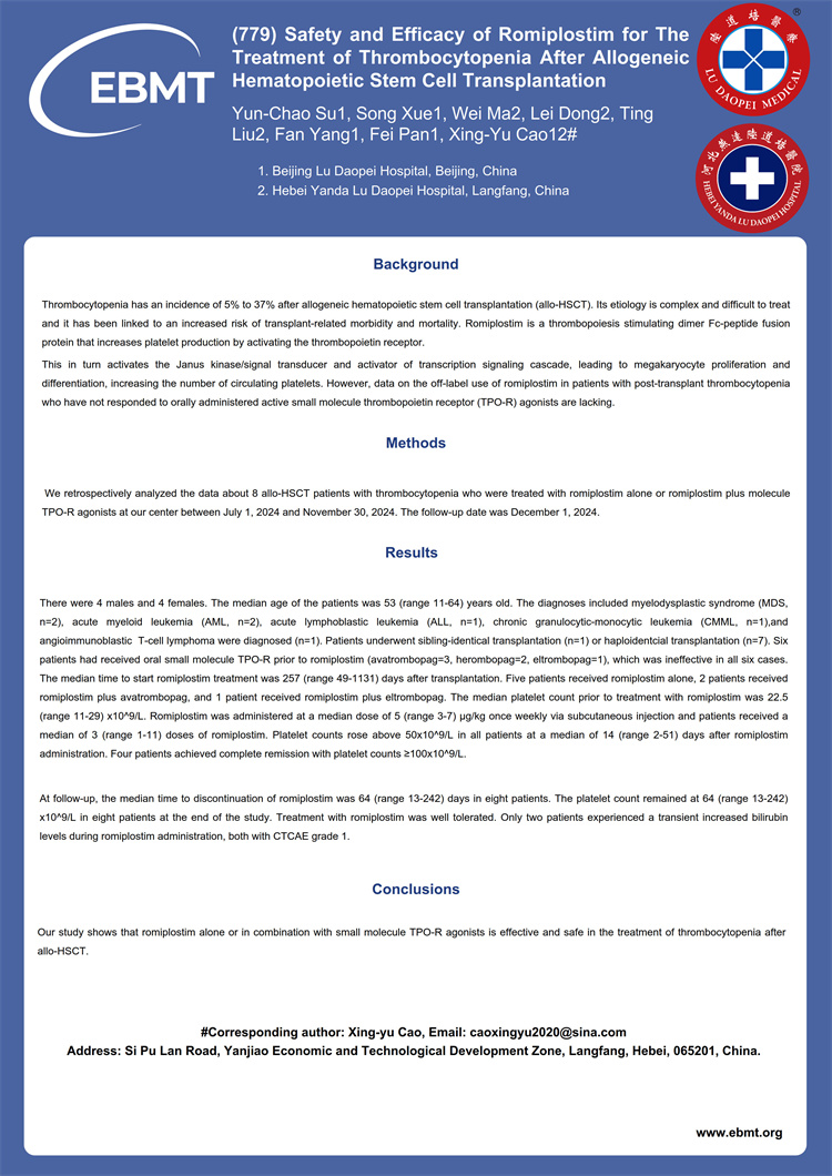 题目:Safety and Efficacy of Romiplostim for the Treatment of Thrombocytopenia after Allogeneic Hematopoietic Stem Cell Transplantation